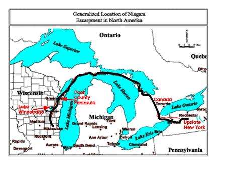 As the impactor’s main body crashed into the N.A. craton at a low angle, the forces drove deep into the earth and upset the static terrain immensely. As it drove down, the center component rebounded up and resolidified. Meanwhile, the crater dug out thousands of feet deep, and the perimeter walls were uplifted. Because of its trajectory, the crater is not round but rather oblong. The rebound core was not centered but shifted northwest, closing in on its northern perimeter crater wall. This explains the narrow, but deep (300+feet), Mackinaw Straight. It also explains the Niagara Escarpment that is visible on both the northwest and northeast sides of the Michigan/Huron crater. The northern portion has been completely eradicated by later glacier action as has a lot of other evidence. Glaciers, wind, and weather are earth’s history erasers. The limestone base has been pushed down and now resides beneath the waters of that massive Great Lake. Wisconsin, Northern Minnesota, and Western Ontario are peppered with thousands of lakes of varying size that owe their existence to both this impact and, later, glacier scouring. They are, in fact: debris fields with some having rocky outcrops or hills on their northwest banks. The Niagara Escarpment encircles 2/3 of northern half of the crater, as the western side in Wisconsin can easily be seen as a ridge looking east from 1 to 40 mile from the shoreline of Lake Michigan. It disappears below ground, south of Milwaukee suburbs. The entire region is peppered with limestone quarries and continues south. Driving on the 294 Interstate south of Chicago, the Thornton, Illinois quarry shows the immenseness of this limestone base, but below grade. The land creating Door County and Garden Peninsula, Michigan are remnants of this upthrust of the craters rim. On the other side, the Niagara Escarpment is the dividing line between Lake Huron and Georgian Bay, Ontario. It continues south through Hamilton. After that, it is visible as Niagara Falls.